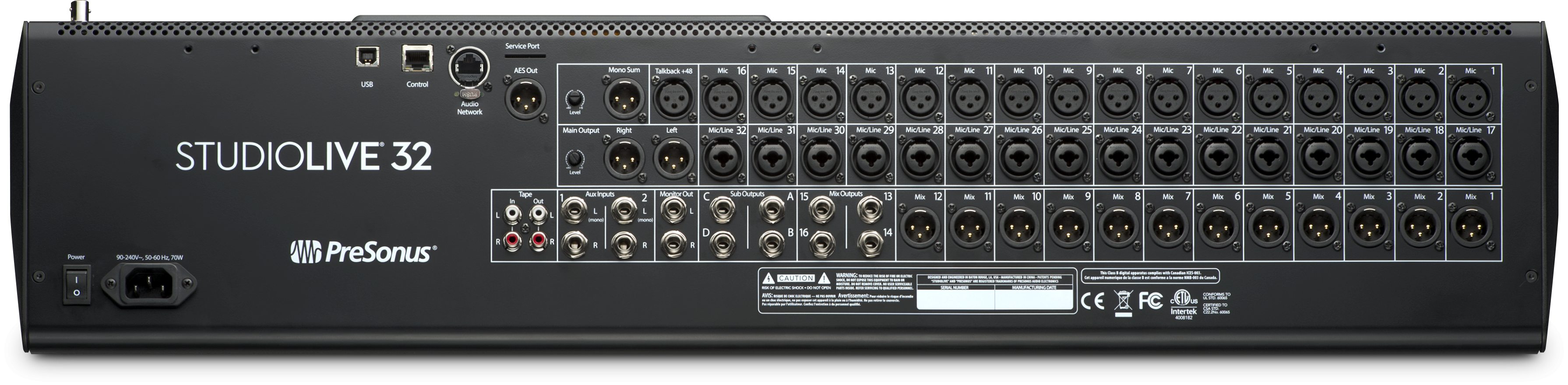 Studiolive 32 III are 16 intrări cu alimentare +48V phantom power, cu conectori XLR, preamplificatoare de microfon XMAX, și 16 intrări combo de microfon/linie cu conectori XLR/Jack 1/4". Adițional, mai beneficiază de 4 intrări auxiliare cu conector jack 1/4" și o intrare dedicată pentru microfon talkback cu conector XLR cu phantom power.