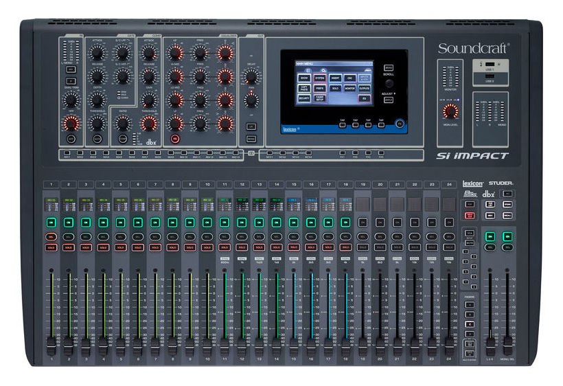Soundcraft Si Impact - mixer digital cu 40 de intrări (32 mono ți 4 stereo/returns). Oferă 32 intrări de microfon cu conector XLR, și 8 conectori combo XLR/jack, 31 buss-uri de ieșire cu EQ grafic BSS pentru fiecare buss, EQ parametric pe 4 benzi pentru fiecare canal și buss, 8 VCA-uri și 8 grupe mute, 4 efecte Lexicon, 26 de fadere motorizate (24 de intrări și LR/mono), 4 layere de fader complet customizabile, display color touchscreen de 5”, display-uri LCD color pentru fiecare fader de intrare, interfață audio 32x32 USB, aplicație pentru control la distanță via iPad, conector Rj45 pentru conectare la Soundcraft Stagebox, slot adițional pentru card Si.