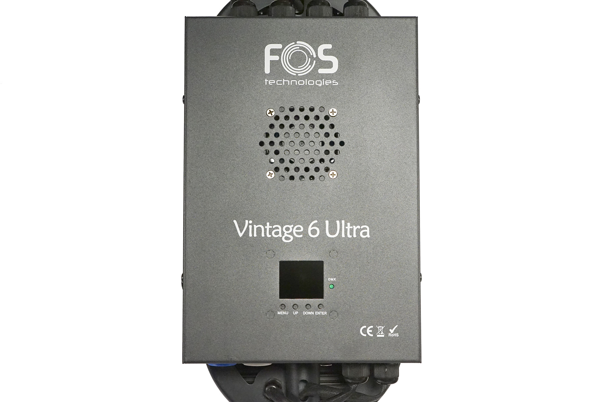 FOS Vintage 6 Ultra - Proiector de iluminat decorativ cu design retro, bazat pe tehnologie LED. Este conceput pentru aplicații de scenă sau evenimente, combinând lumină alb cald cu efect de fundal RGB. Permite control individual al surselor pentru efecte dinamice.
