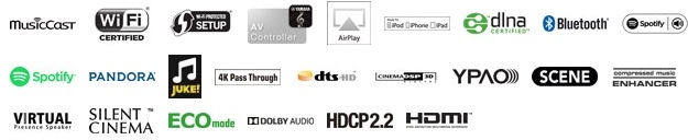 Yamaha RX-V481 - receiver AV cu 5.1 canale, Bluetooth și WiFi incorporat, streaming cu servicii muzicale și fișiere audio de înaltă rezoluție pentru o redare cu fidelitate prin MusicCast - aplicația ce conferă audiții wireless multiroom prin acest receiver AV de rețea cu 5.1 canale și cea mai noua tehnologie 4K Ultra HD.