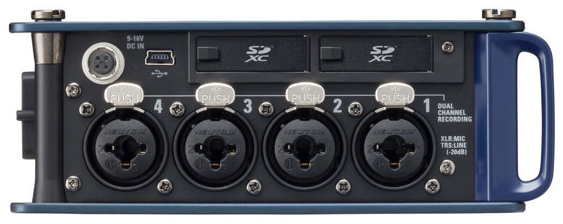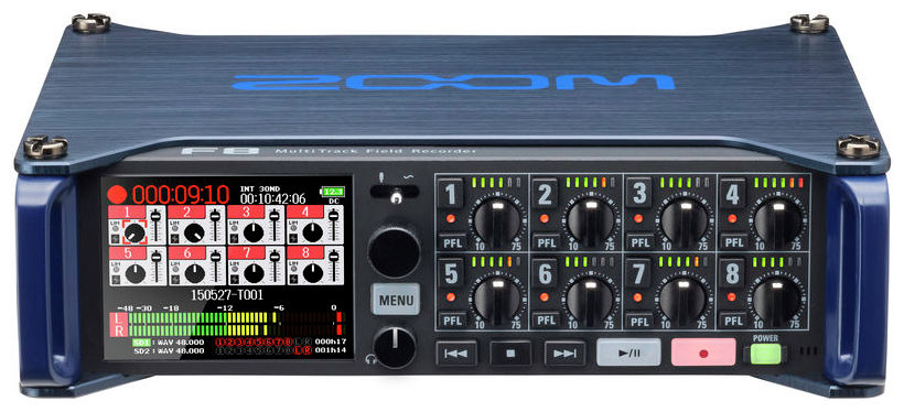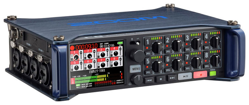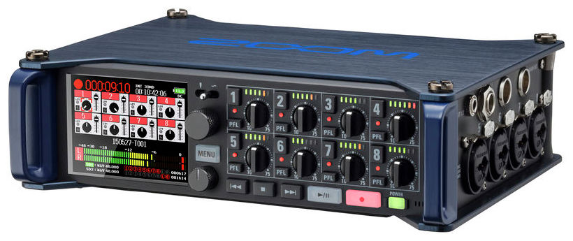 Zoom F8, recorder multi-track pentru înregistrări, industria cinematografică și ENG - F8 are 8 intrări analogice prin conectori combo XLR/Jack ce oferă Gain de intrare de maxim +75 dB și suport pentru intrări de +4 dB cu EIN de -127 dBu. Poate inregistra 10 piste simultane (canalele 1-8 plus mix stereo) sau 8 canale la rezoluție maximă de 24 biți / 192 kHz.