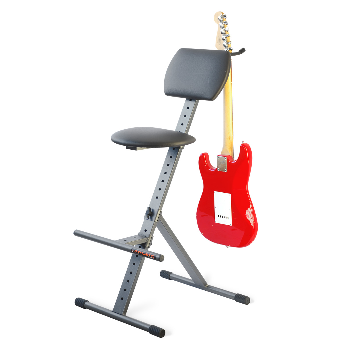 Scaun reglabil din otel pentru chitaristi sau clapari cu posibilitate de reglare pe inaltime cu suport de chitara si sprijin pentru picioare.