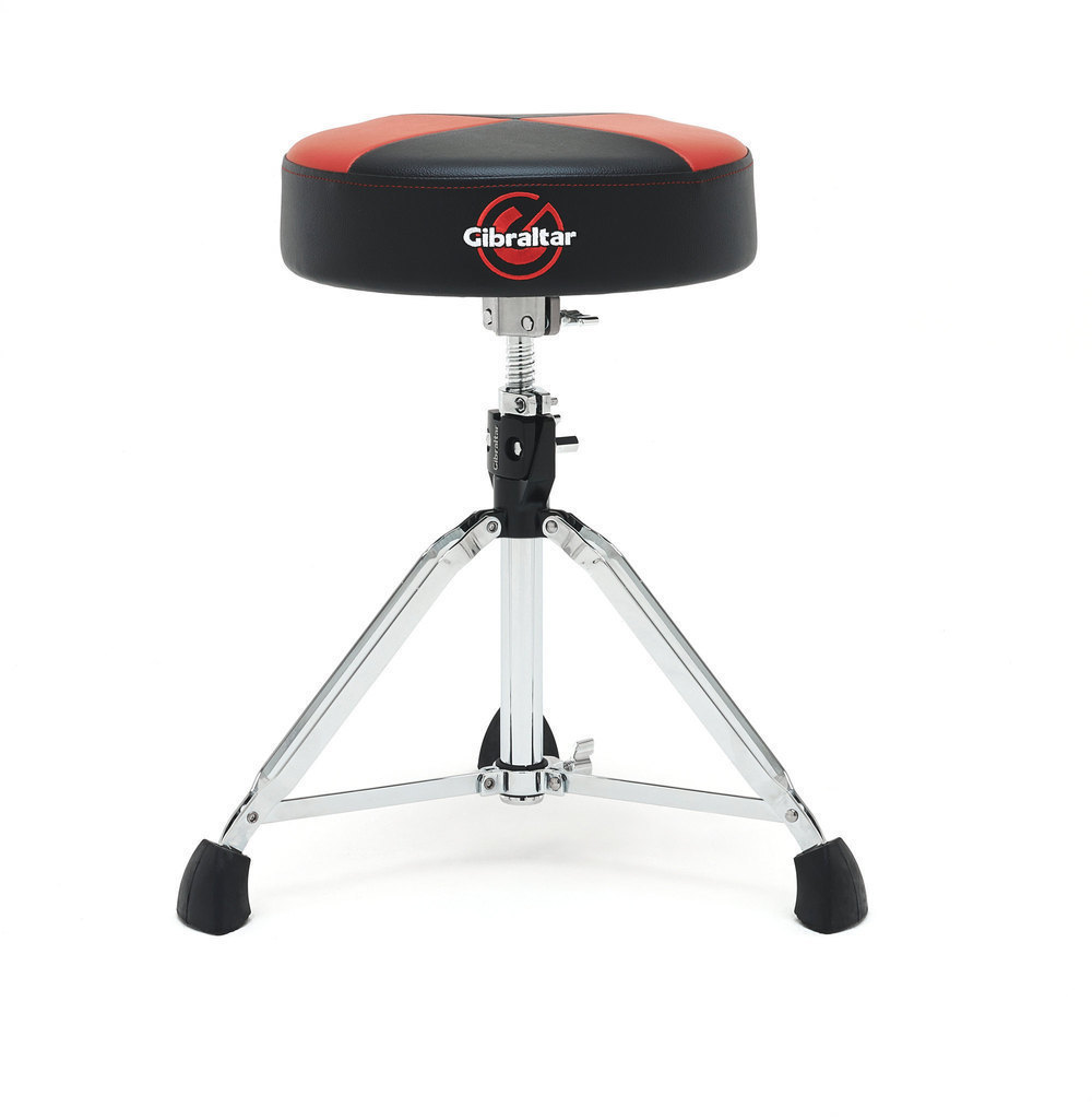 Scaun de tobe cu șezut rotund din din vinil, în două nuanțe negru/roșu. Diametru 35 cm/ căptușeala 9,5 cm. Baza dublu braț. Sistem de prindere 'Super Lock'. Picioare din cauciuc 'Super Foot'. Înălțime reglabilă 51 - 66 cm. Reglare înălțime prin rotatie ax. Blocare memorie pentru reglarea înățimii.