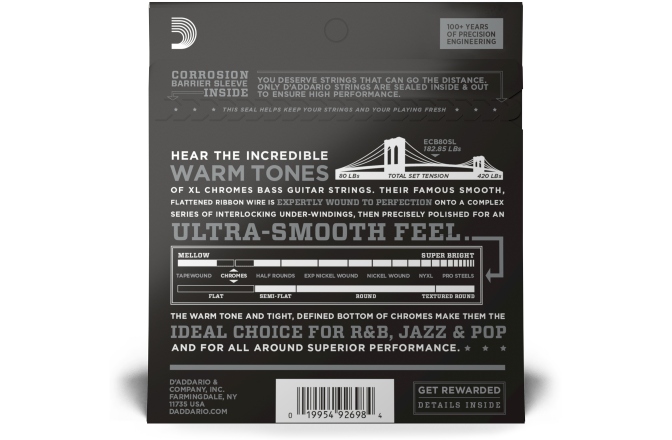 - La fel ca toate corzile de bas D'Addario, XL Chromes sunt realizate cu Hex-Core, asigurând intonație perfectă, senzație consistentă și durabilitate de încredere.