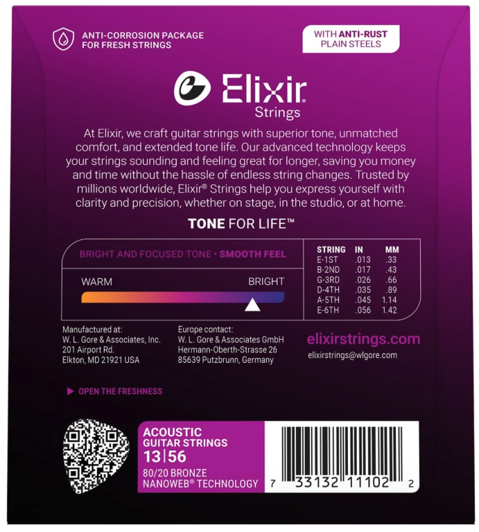 Elixir Nanoweb 80/20 Medium, set de 6 corzi pentru chitarăacustică, corzile sunt acoperite cu un polimer patentat denumit Nanoweb ce oferă durabilitate, dimensiuni 013 - 056.
