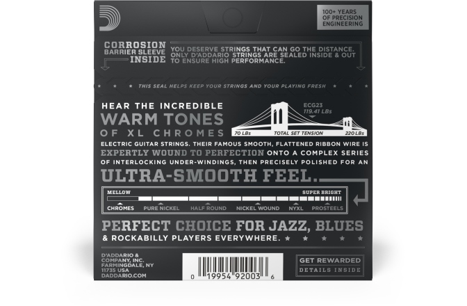 - La fel ca toate corzile de chitară electrică D'Addario, XL Chromes sunt fabricate cu Hex-Core, asigurând intonație perfectă, senzație constantă și durabilitate fiabilă.