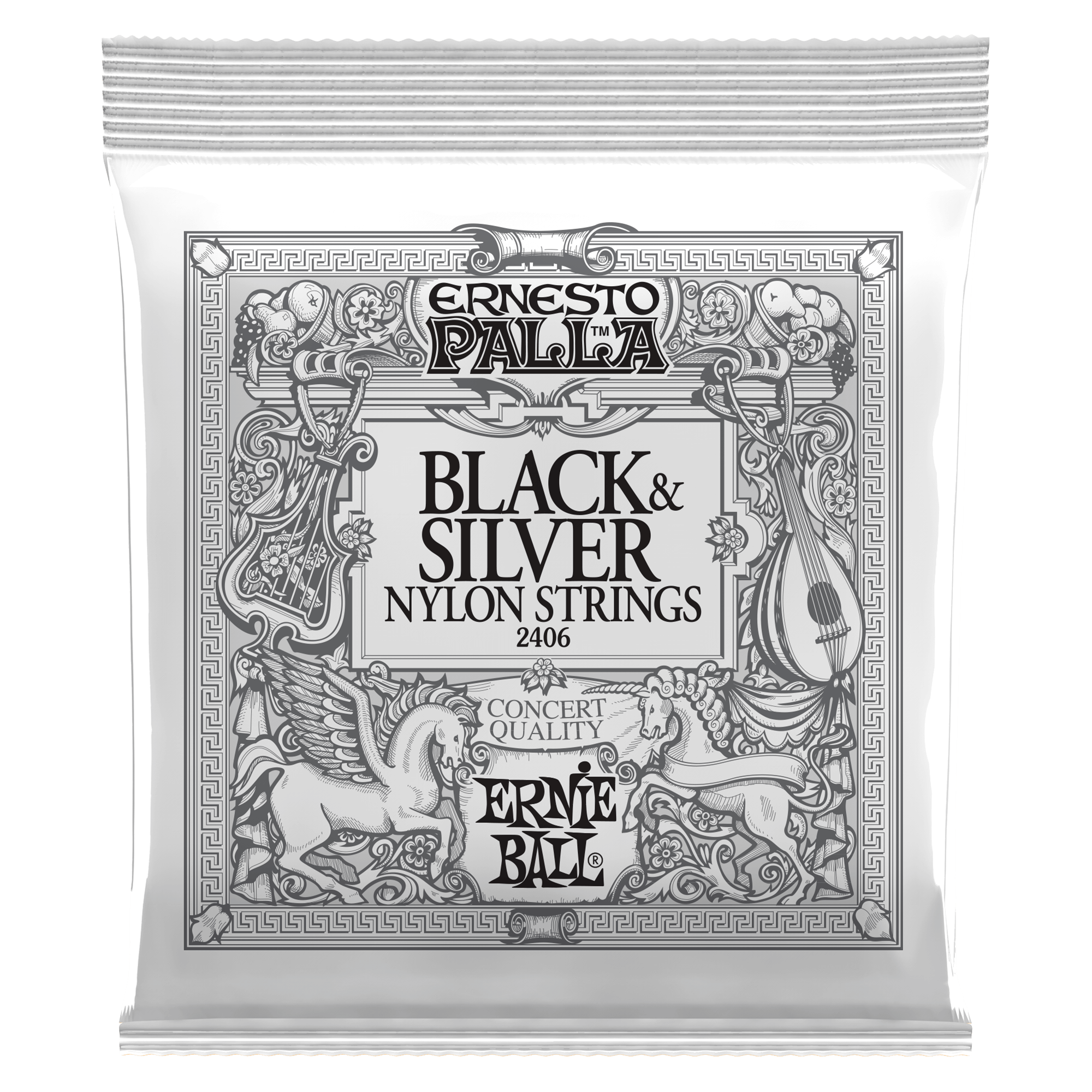 Ernie Ball Ernesto Palla Classical Black&Silver 2406 - Set de corzi pentru chitară clasică cu tensiune medie. Corzile înalte sunt realizate din nylon negru monofilament, iar corzile grave sunt din cupru placat cu argint înfășurat pe miez nylon multifilament. Setul este potrivit pentru chitare clasice.