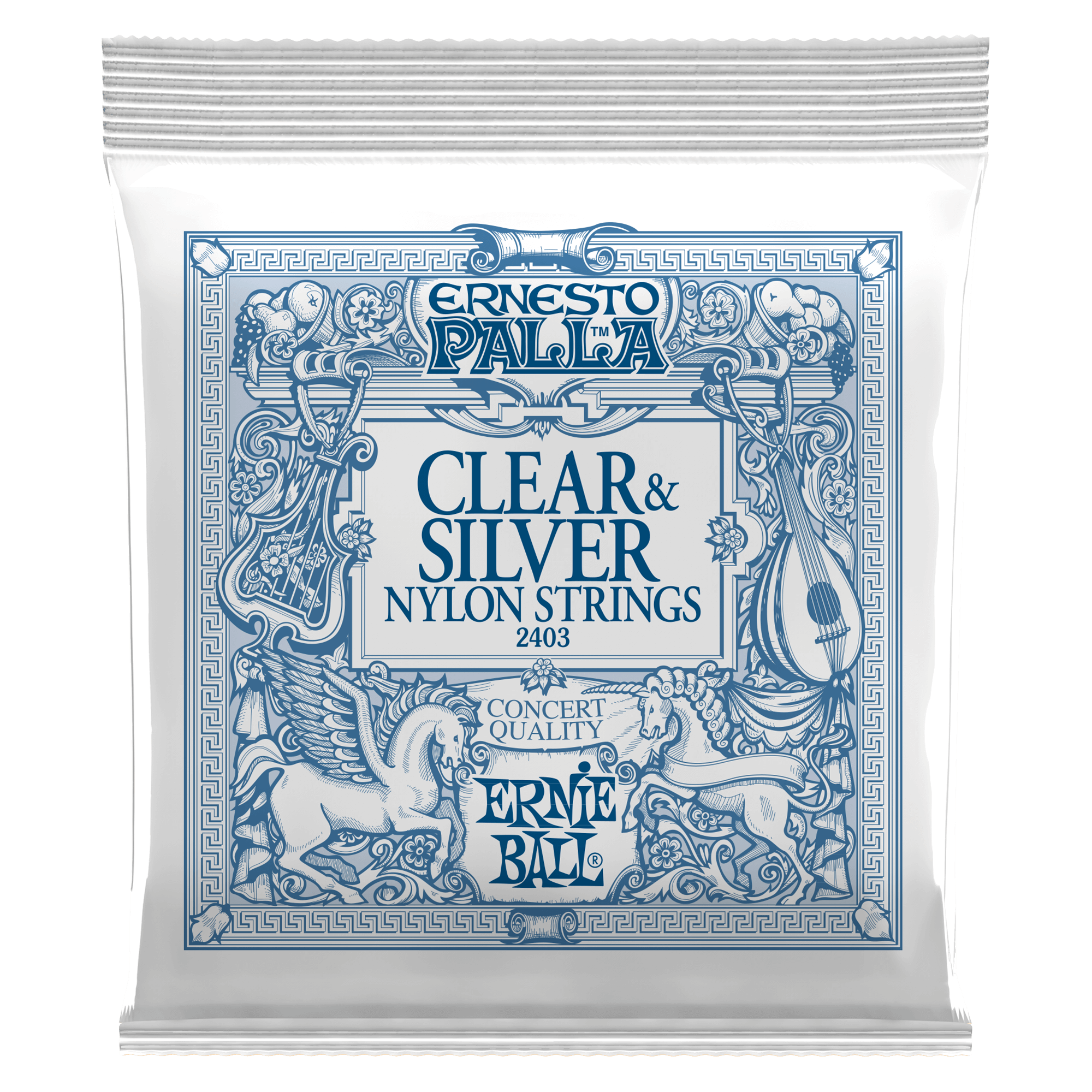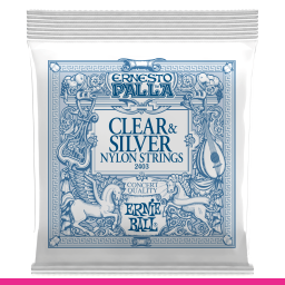 Ernie Ball Ernesto Palla Classical Clear&Silver 2403 - Set de corzi pentru chitară clasică cu tensiune medie. Corzile înalte sunt realizate din nylon transparent monofilament, iar corzile grave sunt din cupru placat cu argint înfășurat pe miez nylon multifilament. Setul oferă un sunet echilibrat și este destinat chitarelor clasice.