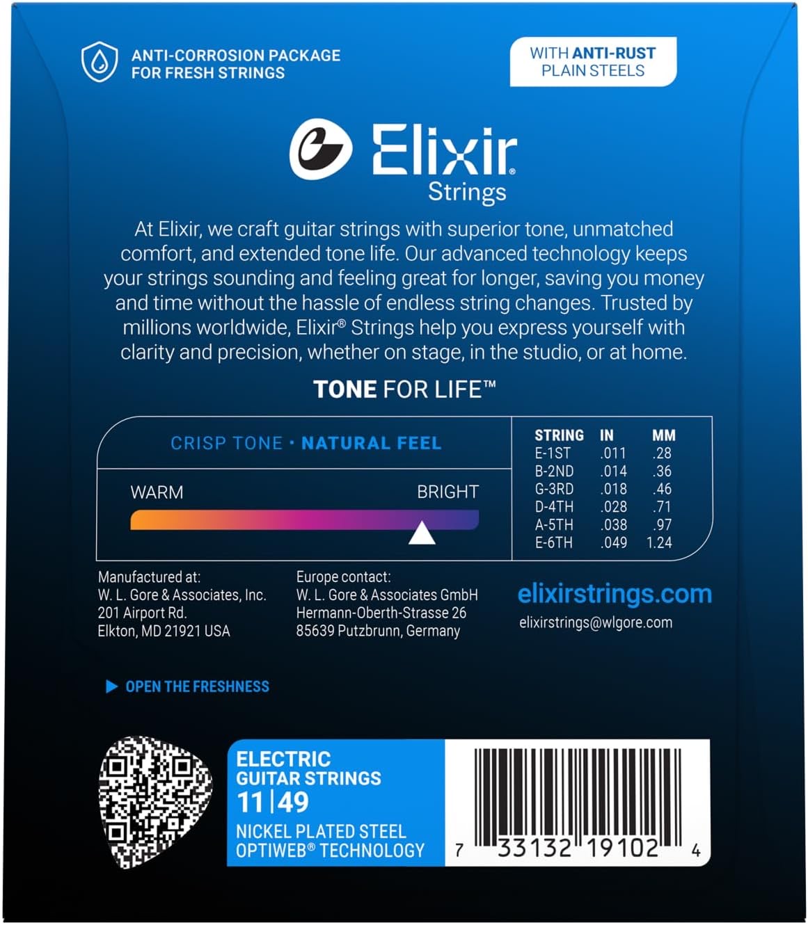 Set de 6 corzi pentru chitarăelectrică, corzile sunt acoperite cu un polimer patentat denumit Optiweb ce oferă durabilitate, caracteristică de sunet: Crisp - Natural Feel, dimensiuni 011 - 014 - 018 - 028 - 038 - 049.