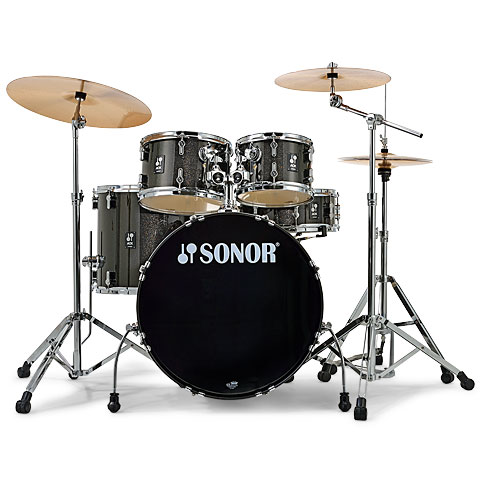 Sonor AQX Stage Kit Black Midnight Sparkle - Set de tobe acustice din 5 piese în configurație standard cu hardware cromat, shell-uri din lemn de plop, fețe pentru toba mare presurdinate, șuruburi de acordaj AQ cu sistem ”TuneSafe” și cinele fabricate din B8 Bronze.