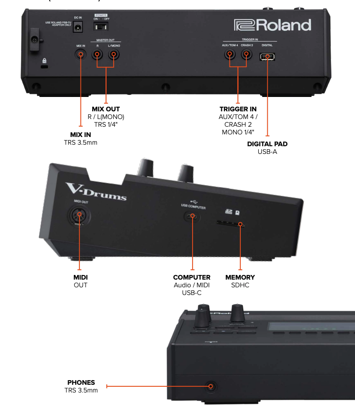 - TRIGGER INPUT (DB-25): pentru Kick, Snare, Tom1–Tom3, Hi-hat, Crash1, Ride, Ride Bell, Hi-hat Control (incompatibil cu pad digital)