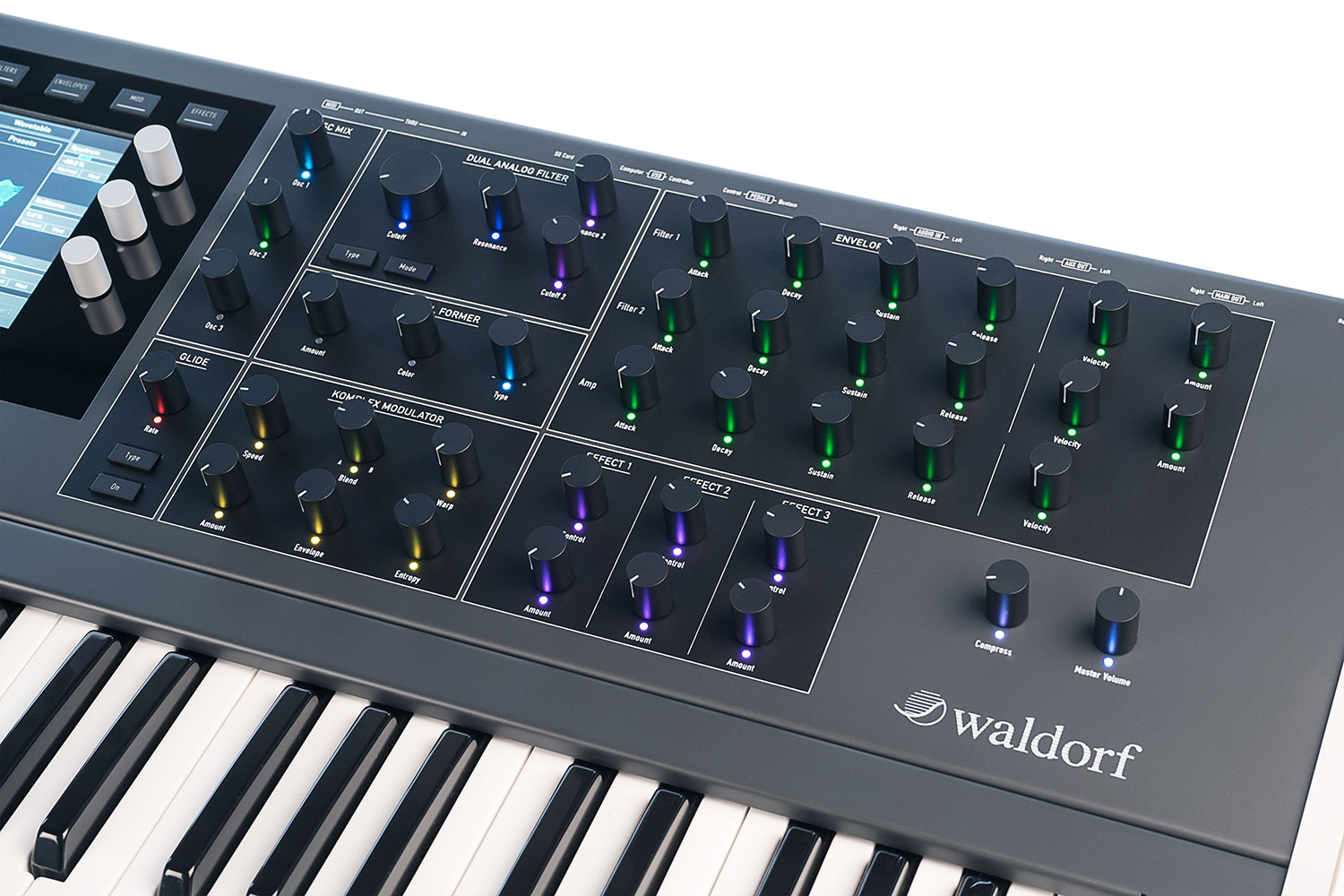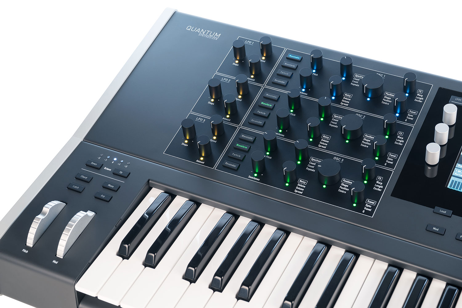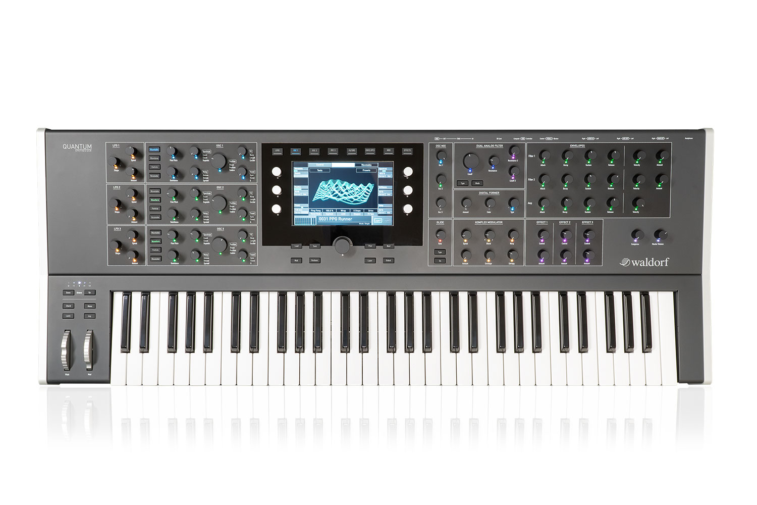 Waldorf Quantum - Sintetizator polifonic hibrid high-end (digital+analog: oscilatoare digitale, filtre analogice) cu 8 voci, echipat cu o claviatură Fatar TP/8SK cu 61 de clape și aftertouch, 3 oscilatoare digitale pe voce și posibilitatea de selectare între generatoarele de sunete. Dispune, de asemenea de un ecran tactil intuitiv, knob-uri și encodere din aluminiu iluminate LED, oferind astfel un aspect elegant și un workflow facil.