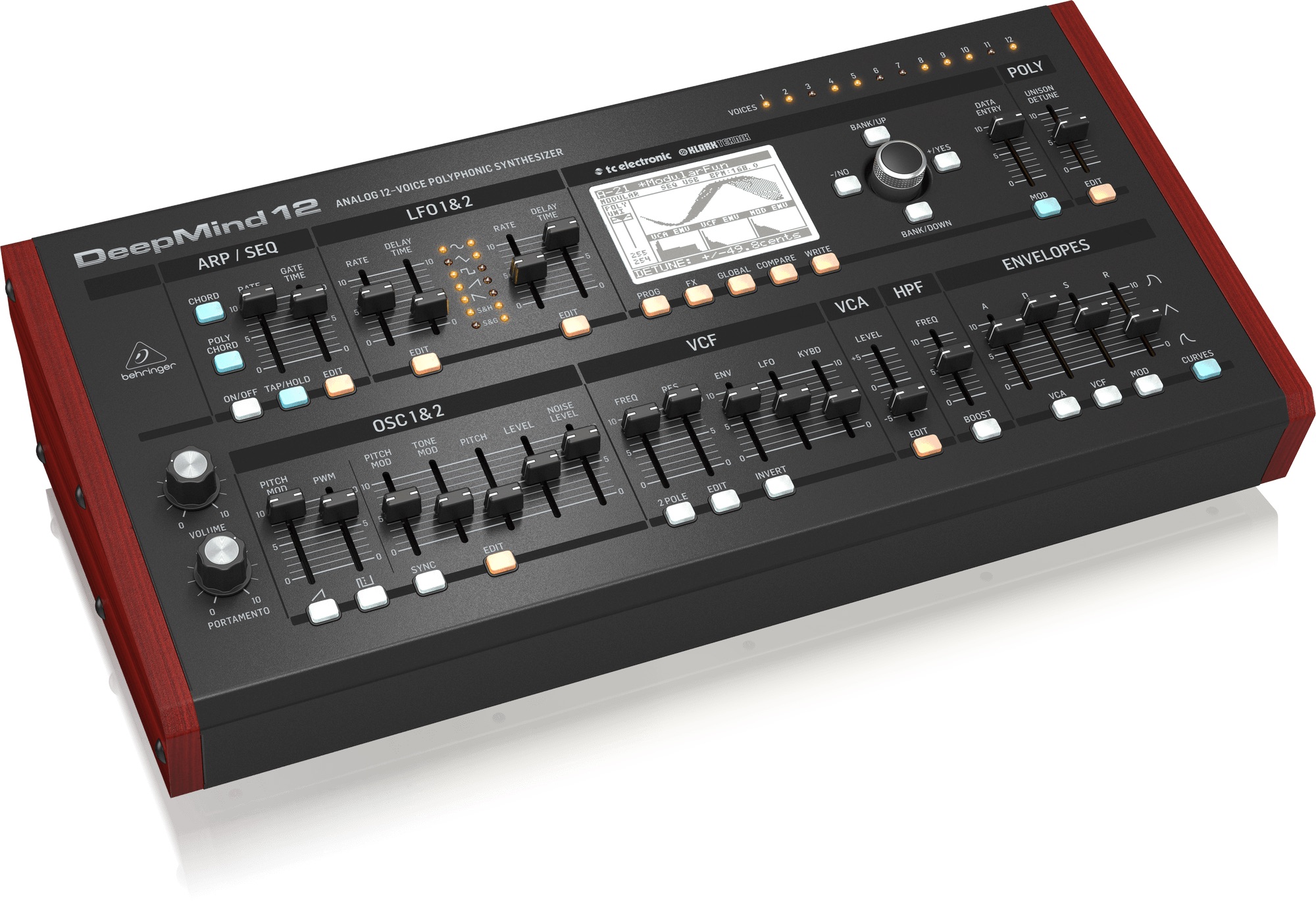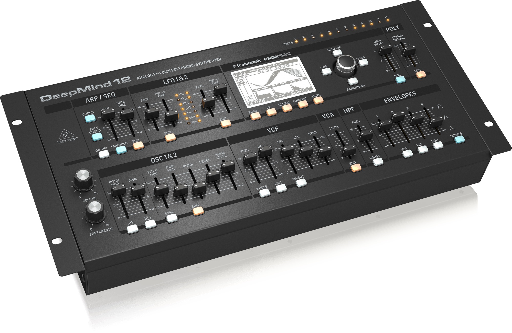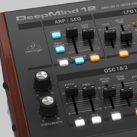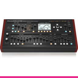 Behringer DEEPMIND 12D – Sintetizator analogic desktop cu 12 voci, cu 4 FX engines, 2 OSC și LFO per voce, 3 generatoare ADSR, matrice de modulație 8 canale și sequencer 32-step, control de la distanță prin iPad/PC/Mac și WiFi integrat.
