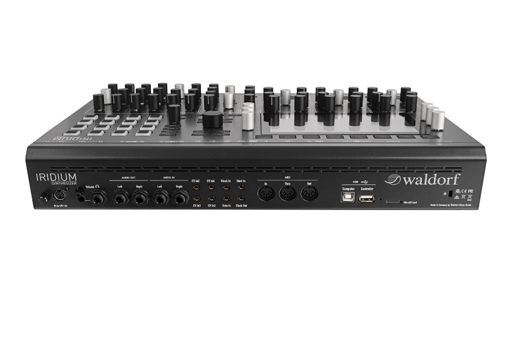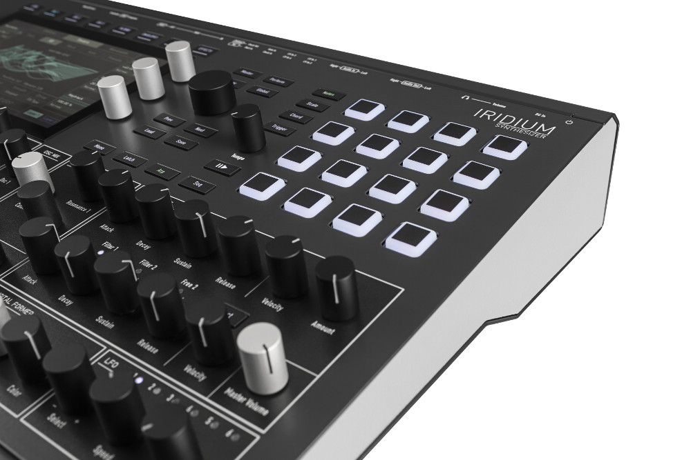 Waldorf Iridium - Sintetizator polifonic digital high-end cu 16 voci, echipat cu 16 pad-uri din silicon cu iluminare RGB, 3 oscilatoare digitale pe voce și posibilitatea de selectare între generatoarele de sunete. Dispune, de asemenea de un ecran tactil intuitiv, knob-uri din aluminiu și carcasă metalică, oferind astfel, un aspect elegant și un workflow facil. Este compatibil cu generatorul de sunete synth regăsit la modelul Waldorf Quantum.