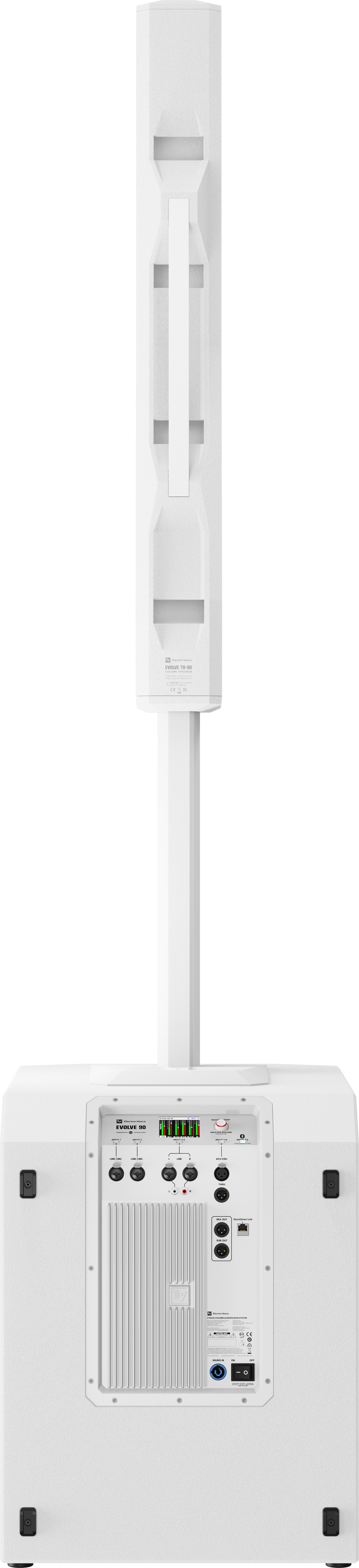 Electro-Voice Evolve 90 White Column System - Sistem PA de tip coloană cu Subwoofer. Oferă un SPL maxim de 134 dB, dispune de opt drivere neodymium de 4,7" pentru satelitul tip coloană, având acoperire de 120° x 25° prin intermediul ghidurilor de undă proprii, ajutate de un subwoofer de 18” ce asigură extinderea frecvențelor joase până la 28 Hz, iar procesarea FIR avansată asigură un răspuns liniar al frecvenței.