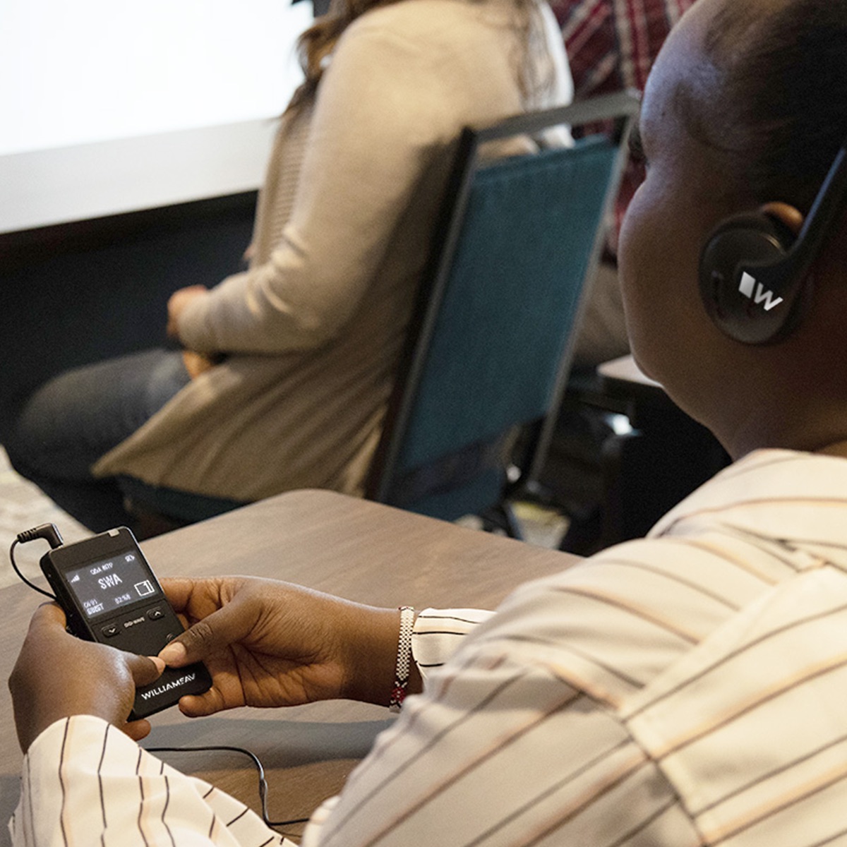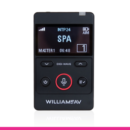 Williams AV Digi-Wave AIM Transceiver - transceiver portabil conceput pentru interpretare simultană și comunicare bidirecțională în întâlniri, traininguri și tururi. Permite discuții bilingve cu funcție Q&A și gestionarea flexibilă a canalelor și grupurilor, folosind Advanced Interpretation Mode.