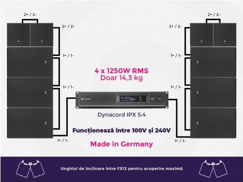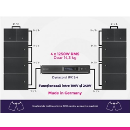 Dynacord Xa2-PRO IPX5:4 / 4 x FX12 / 4 x FX20 - Dynacord Xa2 PRO IPX5:4 este un sistem de sonorizare profesional conceput pentru evenimente de interior și exterior, precum concerte live, aplicații mobile de DJ sau instalații de sunet în cluburi. Acest sistem puternic și versatil este compus din 4 sateliți FX-12 Pro pentru frecvențe medii-înalte, 4 subwoofere FX-20 Pro pentru bas puternic și un amplificator audio IPX5:4 cu tehnologie FIR-Drive.
