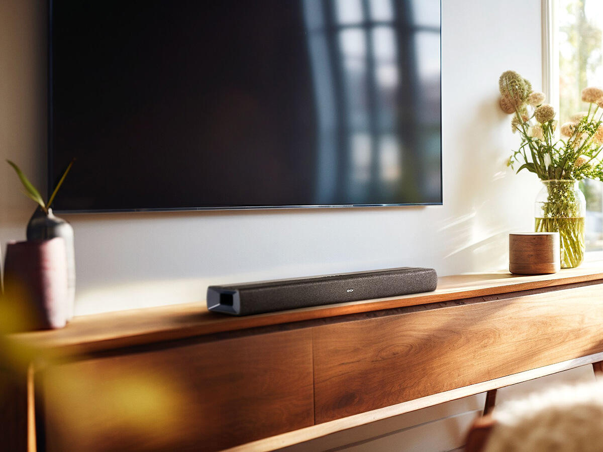 Denon DHT-S218 - Soundbar cu profil subțire, ce dispune de două subwoofere integrate și Dolby Atmos, oferind sunet 3D captivant și streaming muzical wireless prin Bluetooth® LE Audio.