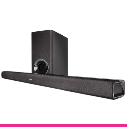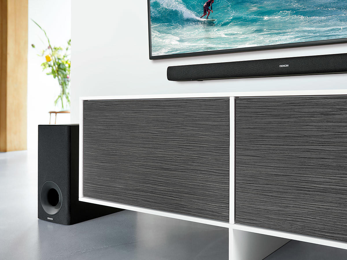 Sistem audio compus din Soundbar ultra-subțire cu subwoofer wireless, compatibil Dolby Digital și DTS, oferind sunet 3D imersiv și claritate îmbunătățită a dialogului prin Denon Dialogue Enhancer.
