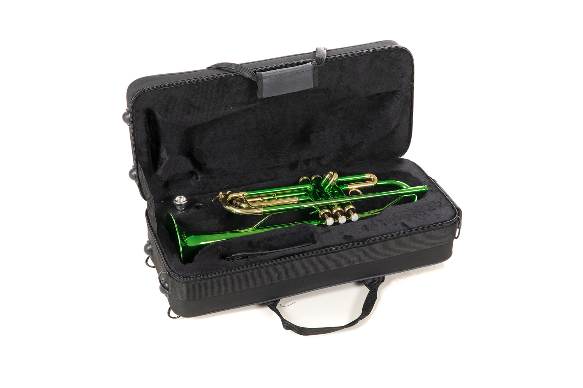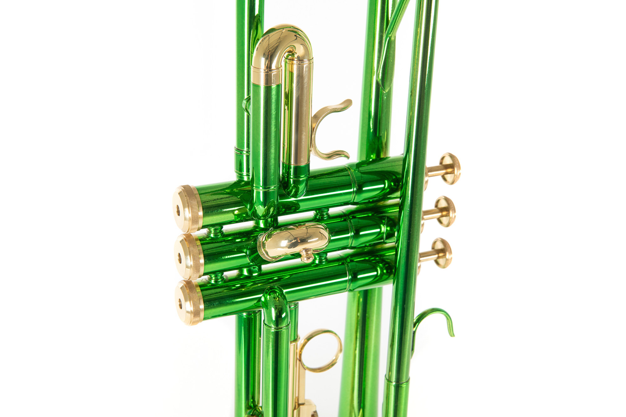 Roy Benson TR-101E Student - Trompetă Bb cu gaura medie (ML), corp din alamă, țeavă principală aurită din alamă, pistoane din oțel inoxidabil, și finisaj lăcuit în verde.