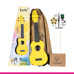 Pachetele de ukulele Keiki vin cu tot ce ai nevoie: un ukulele de mărimea unei soprane, o geantă cu snur, un tuner, cinci pleturi și o curea. Ukulele are un corp din ABS și un top Agathis