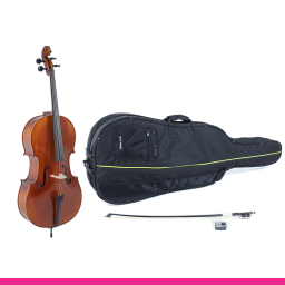 Tonewood european, selecționat manual. Spate și eclise arțar european solid creț, fața solidă din molid european selecționat. Lăcuit manual cu alcool tehnic, fin, maro-roșcat auriu, Antic, inserted purfling. Accesorii abanos, Original Aubert căluș, cordar Wittner cu fixuri, corzi Larsen Aurora, end pin, sacâz, arcuș de Massaranduba cu păr natural, husă cu buzunar arcuș și corzi, curele tip rucsac. Este posibilă o ușoară abatere de culoare din cauza lăcuirii manuale.