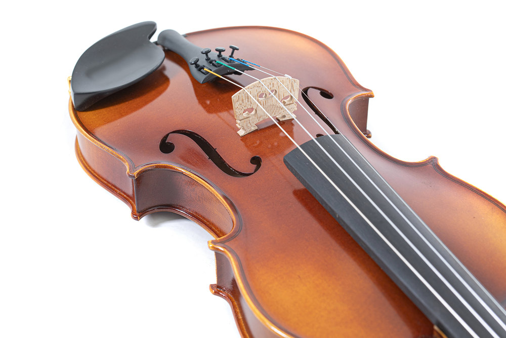 Spate și eclise solide din arțar european, fața solidă din molid european. Lac rășina naturală maro chihlimbar, lăcuit manual, inserted purfling. Accesorii abanos, căluș Original Aubert preajustat, cordar Wittner cu fixuri, corzi Larsen Aurora, bărbie abanos, sacâz, arcuș Carbon cu păr natural, cutie dreptunghiulară cu parte exterioară înșurubată, curele tip rucsac și dungi reflectorizante. Posibil diferență ușoare de nuanță datorită lăcuirii manuale.