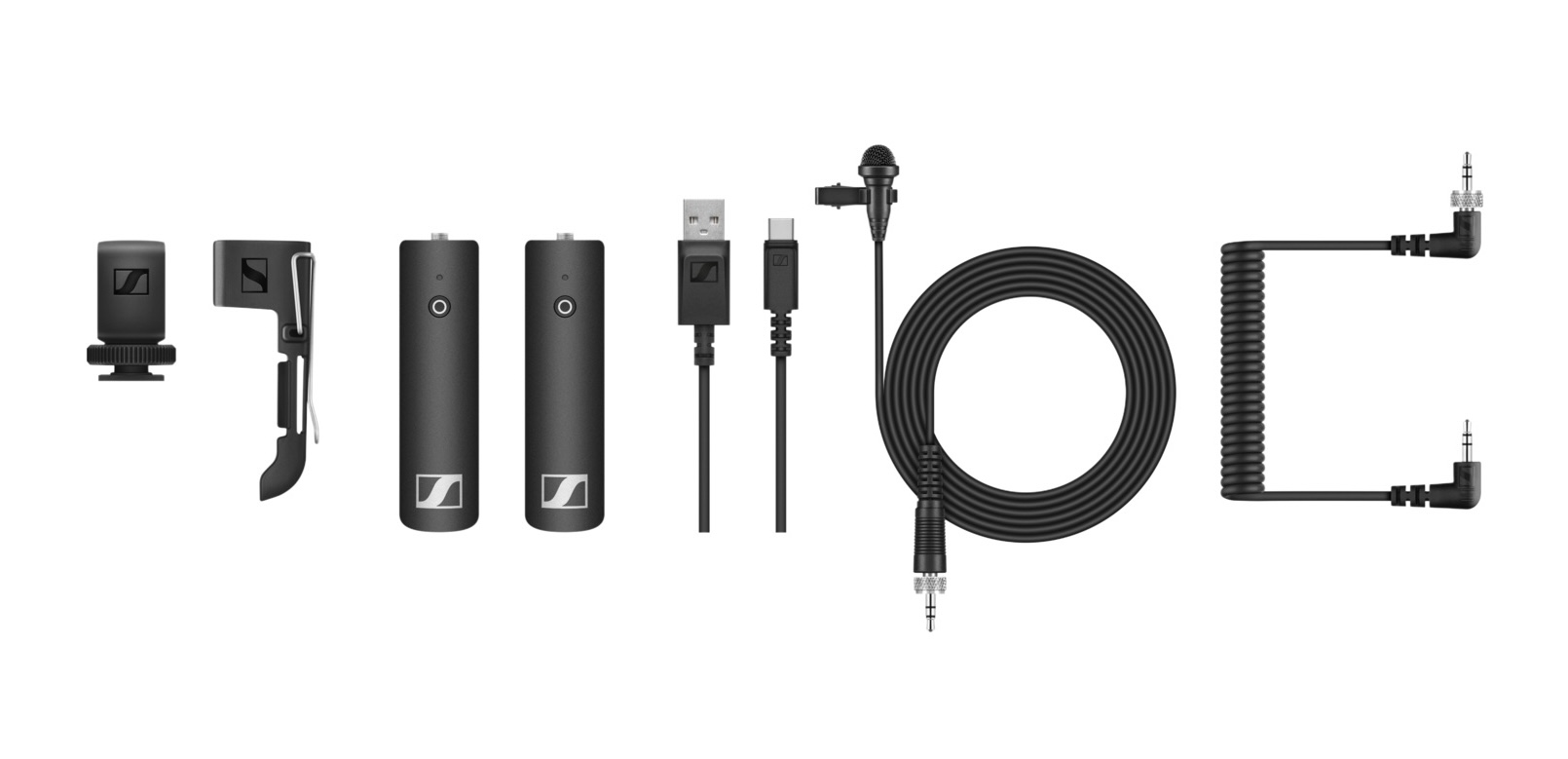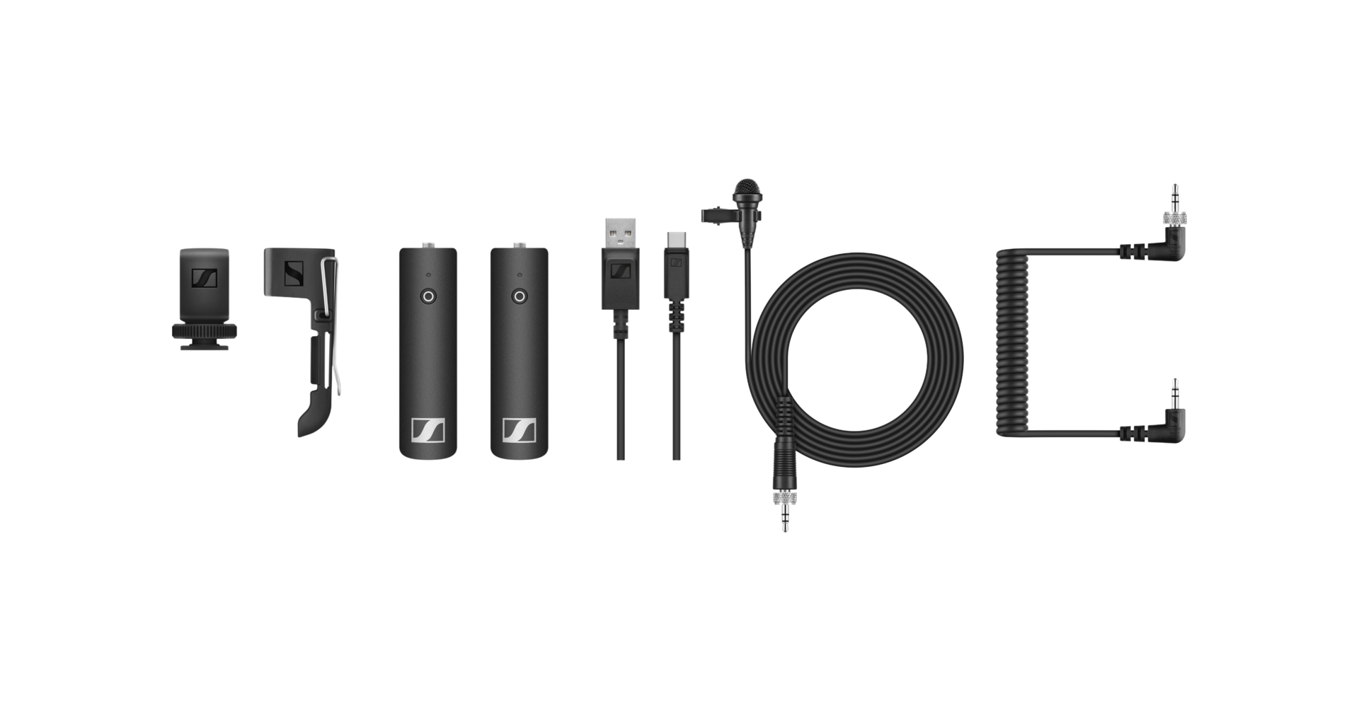 - Cablu spiralat 3,5 mm, montură cold-shoe, clip pentru curea și cablu USB-A → USB-C pentru încărcare.